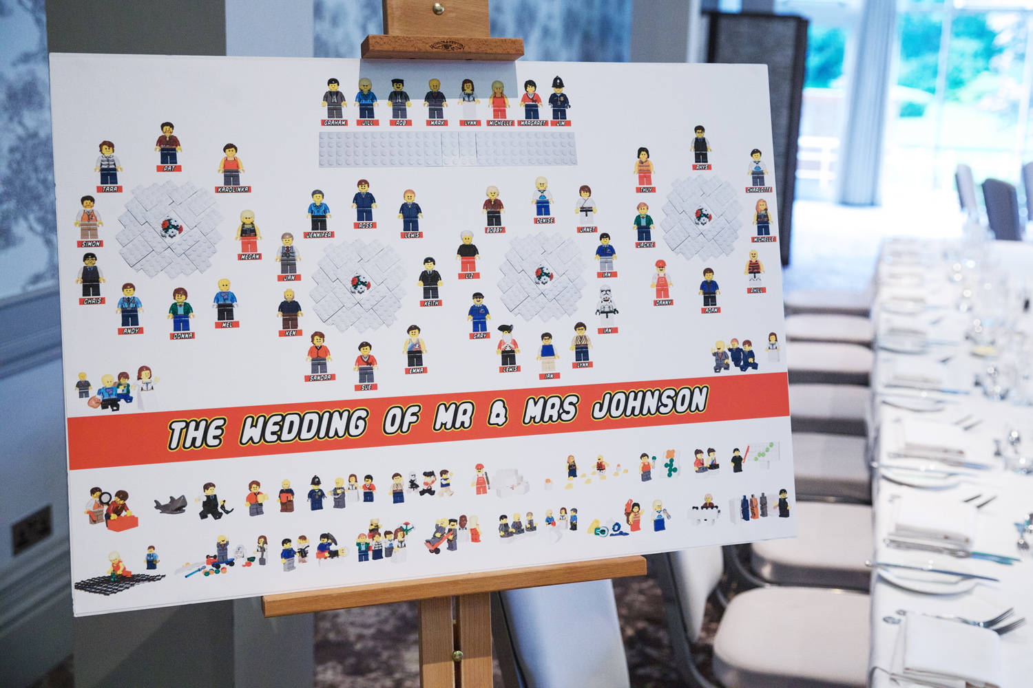 I will keep this post short and to the point, as the images speak to themselves. The Lego Rose & Thistle Vases were setup per table, with their personalised favours. I also added some last minute Lego letters for the top table spelling out our new name – Mr & Mrs Johnson. Wooden letter boxes full of Lego bricks were also provided for our guests…. even if it did mean I ended up with a variety of Lego cocks by the end of the evening!